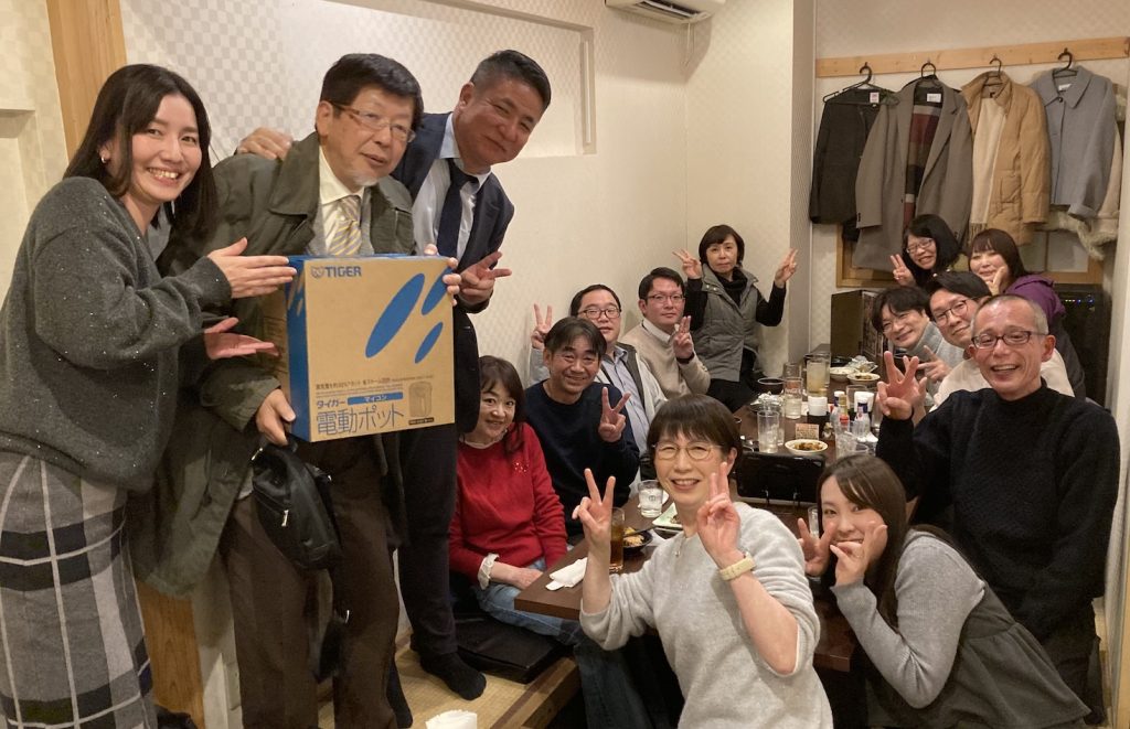 23日金曜日、地域の経営者の集まる年始会が終わってから、天文館で楽しんでいる、法人グループのケアマネジャーさんたちの年始会に立ち寄ってみました。私はすでにかなりアルコールを飲んだ状態だったので、何を話したのかをよく覚えていませんが、かねてよりケアマネジャーとして頑張ってくれている職員たちを激励したのではないかと思います。(全然記憶がありません)帰り際に集合写真を撮ったようで、後日Gmailで送られてきました。下がその写真です。手に持っているのは、年始会の抽選会で引き当てた電動ポットです。